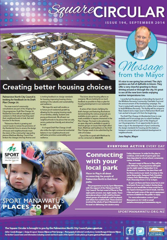 The Square Circular was Palmerston North City Council's monthly community publication, informing Palmerstonians of PNCC initiatives, activites, and events. This month's issue includes: Draft Plan change; community housing; Jono Naylor; Sport Manawatu; Wildbase Recovery Community Trust; councillors; Local Initiatives Fund; grants; Committee Meetings; conservation; climate action; civil defence.