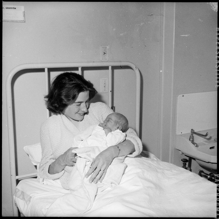 This image was not published in The Manawatu Evening Standard taken on 2 January, 1964. "Four babies delighted thier parents by arriving on New Year's Day at the Palmerston North Maternity Home. The son born to Mrs H. T. Clark made his entry into the world at one minute past midnight. Top left is Mrs H. T. Clark with her son: top right is Mrs B. Kenna with her daughter: bottom left is Mrs M. Sherman with her son: and bottom right is Mrs A. H. Grant with her son." This image is Mrs Sherman and her son. Another image of the two was published on 2 January, 1963. See also: 2017N_2017-20_018261, 2017N_2017-20_018262, 2017N_2017-20_018263