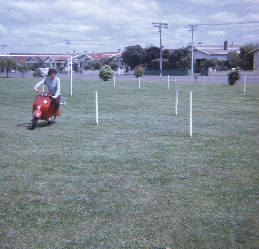 R. Mathews of Class 84, November 1967. As part of the road safety course, students are required to master handling of their motorcycles, including emergency stops, handling obstacle courses, and as shown here, slaloming between poles in the field beside the school.