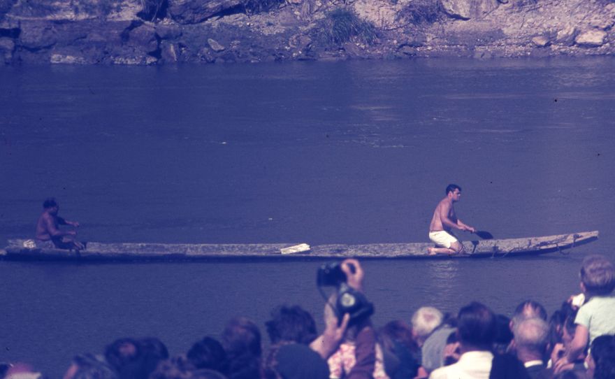 This image compliments a story that ran in The Manawatu Evening Standard on 13th March 1971 [Two men are rowing a waka down the Manawatu River as part of the re-enactment of the Snelson's canoe landing from 1871.]