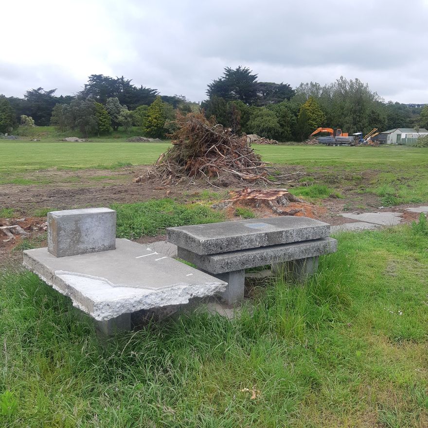 These concrete benches were removed to make-way for the redevelopment of the former Teaching College / Massey Hokowhitu Campus' playing fields. Many of the felled trees were piled together and burned.