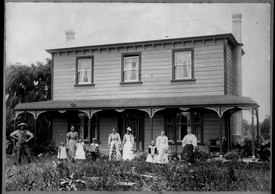 The Dear family homestead on Taipo Road, Rongotea. Some of the Dear family children are pictured in front of the house. Mrs Dear has not been identified, but she is possibly on the far right. Mr Dear is on the far left.