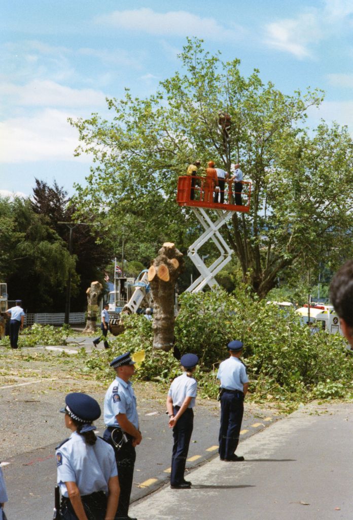 Police removing a protestor from a tree on Fitzherbert Avenue. Avenue Action was formed in protest against the Palmerston North City Council removal of trees in Fitzherbert Avenue. This was to allow for four lanes of traffic as an engineering solution to cross-river transportation problems in 1997. The Avenue Action collection is held in the Community Archives.