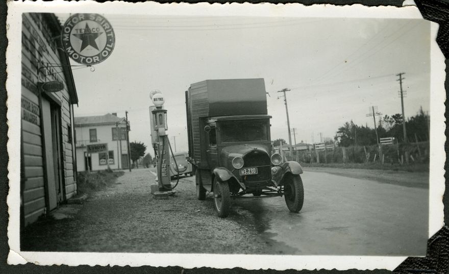 A truck parked at a petrol pump at Bunnythorpe Garage.