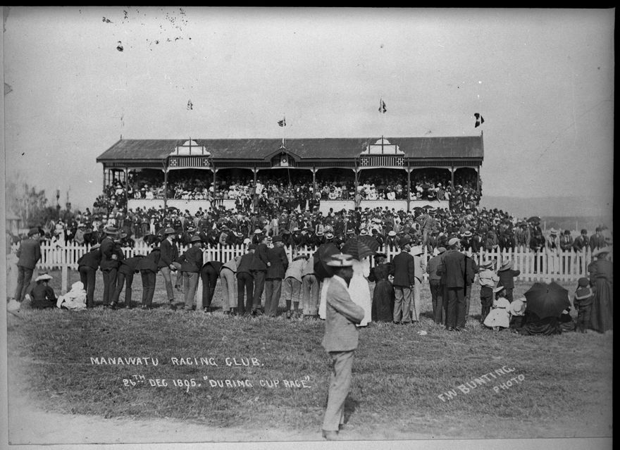 The race course was originally situated near the junction of Botanical and Park Road (between the Manawatu River and Wikiriwhi Crescent). In 1903, because of erosion from the river, the race course was moved to its present site at Awapuni. This photograph looks south-eastward and shows the Grandstand on the river side of the racing track. The spectators are evidently watching the horses as they approach the finishing line during the cup race.