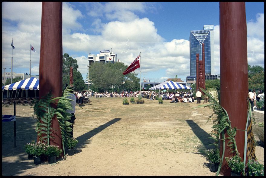 Images from the re-dedication of Te Marae o Hine on Saturday, 3 March, 1990. The following notes were written by City Archivist, Ian Matheson, around the time of the re-dedication. Background: Te Marae o Hine is that part of The Square on which stands the statue of Te Peeti Te Awe Awe and the City Council building. The name, The Courtyard of the Daughter of Peace was offered to Te Peeti Te Awe Awe one hundred and eleven years ago by Matene Te Whiwhi, Paramount Chief of Ngati Raukawa in memory of his ancestress, Rongorito, a famous peacemaker who lived in Waikato thirteen generations ago. Te Peeti Te Awe Awe received the name and offered it to the first Mayor of Palmerston North, George Snelson in the hope that there would be peace between all citizens of Palmerston North. 1990: The City of Palmerston North has commissioned a set of 9 great carvings to be placed in that part of The Square called Te Marae o Hine to form a gathering place for all people. The people of Rangitāne, tangata whenua of this area have imbued these taonga with their mana. They stand as a memorial to Rongorito and a tribute to the vision of Te Peeti Te Awe Awe, Matene Te Whiwhi and George Snelson.