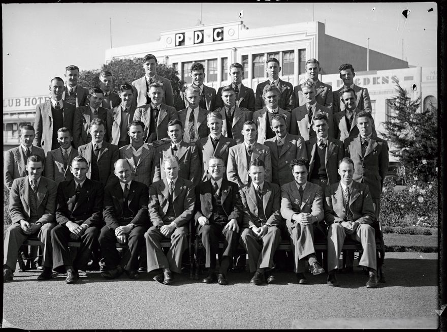 Unindentified group of Young Farmers in The Square with the PDC in the background.The Young Farmers movement began in England in the 1920s, but migrated to New Zealand soon after. The first club started in Feilding in 1927.