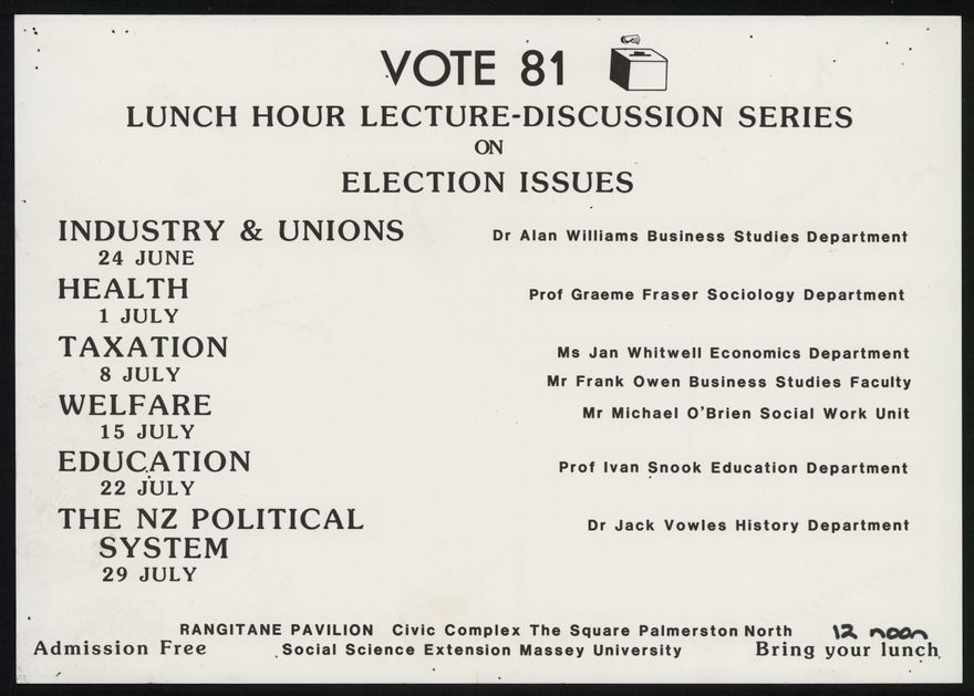 "Vote 81. Lunch hour lecture - discussion series on election issues. Industry & Union 24 July, Dr Alan Williams Business Tudies Department. Health 1 July, Prof Graeme Fraser Sociology Department. Taxation 8 July, Ms Jan Whitwell Economics Department, Mr Frank Owen Business Studies Faculty. Welfare 15 July, Mr Michael O'Brien Social Work Unit. Education 22 July, Prof Ivan Snook Education Department. The NZ Political System 29 July, Dr Jack Vowles History Department. Rangitane Pavilion. Civic Complex The Square, Palmerston North. 12 Noon. Admission free. Social Science Extension Massey University. Bring Your Lunch." Part of a collection of posters that were displayed in the Public Library in the 1970s - 1980s.