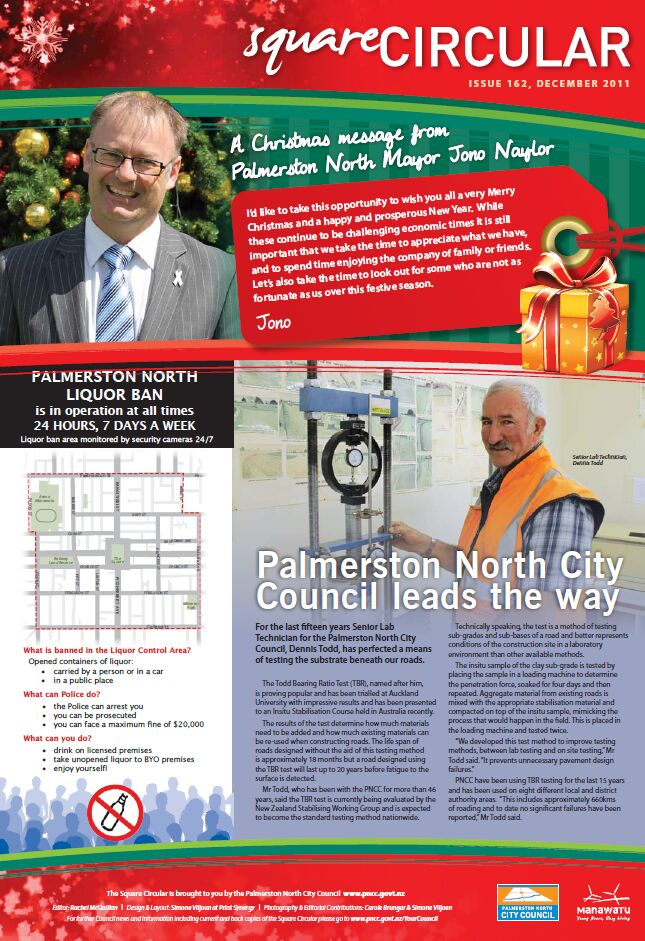 The Square Circular was Palmerston North City Council's monthly community publication, informing Palmerstonians of PNCC initiatives, activites, and events. This month's issue includes: Liquor Ban; Funding; Sustainability; Civil Defence; Rose Garden; Pet Safety; Cycling; Anti-crime; Recycling.