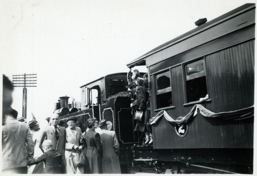 Palmerston North held its 75th Jubilee Celebrations during the week of 15th March 1952. This locomotive was decked with flags and ribbons to give a special trip to commemorate the occasion. Well-dressed passengers are shown leaving one of the carriages.