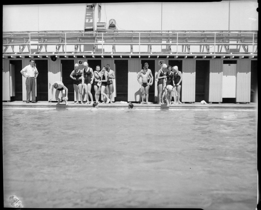 This image was taken for a story that ran in The Manawatu Evening Standard on 9 February, 1959. "Otago swimmers who will compete this week in the national junior and intermediate swimming championships in Palmerston North freshen up with some light training over widths at the Municipial pool this morning."