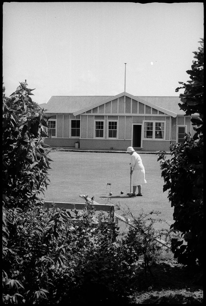 This image was taken for a story that ran in The Manawatu Evening Standard on 9 January, 1964. "One of the members of the Northern Croquet Club prepares to make her stroke during a match playing on the club's ground on Saturday. Windy conditions did not assist the players but some fine scoring strokes were seen."