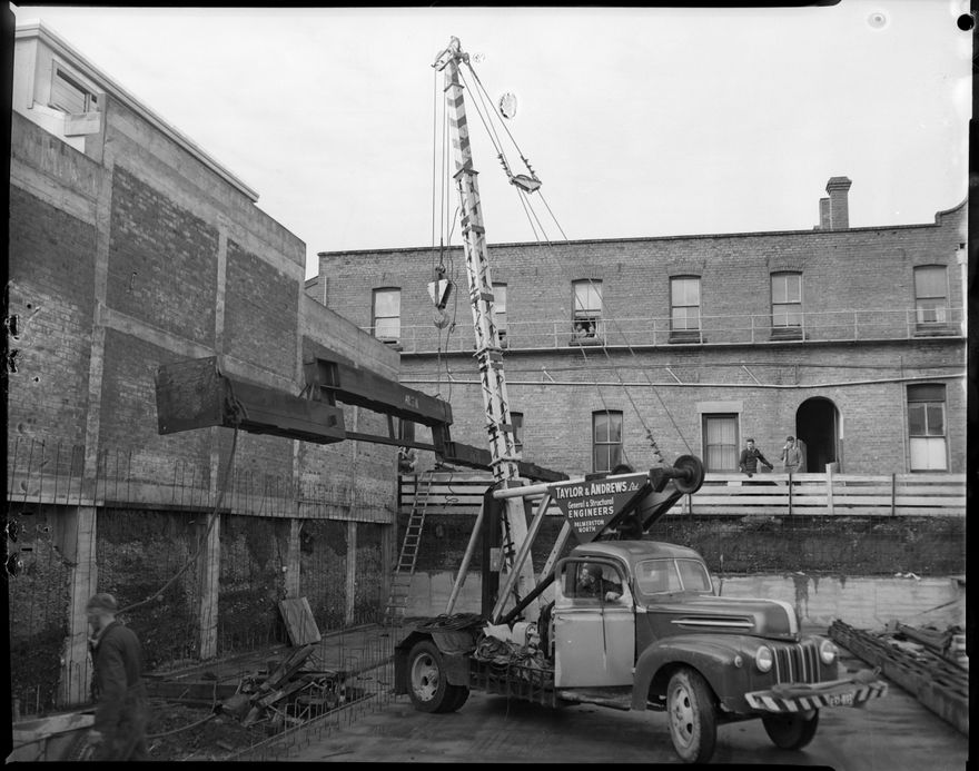 This image was taken for a story that ran in The Manawatu Evening Standard on 28 June 1958, page 8: "This huge girder was swung into position this morning on the corner of Rangitikei and Queen Street to form part of the massive construction of the new Government Life Insurance Building."