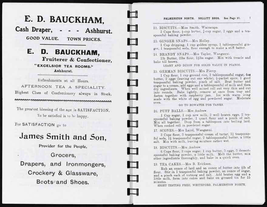 A reproduction of Our Own Cookery Book compiled by Mrs J. West for the Ashhurst Town Band Bazaar. The cook book features community submitted recipes (including the names of contributors) and includes many advertisements of local area businesses.