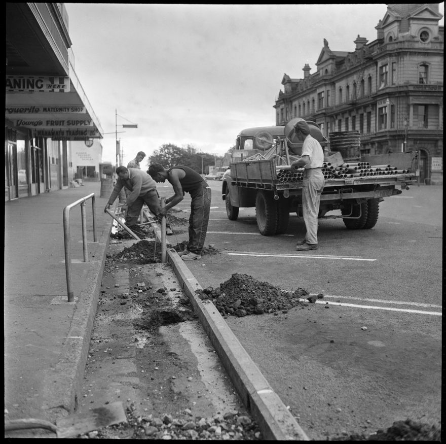 This image was taken for a story that ran in The Manawatu Evening Standard on 03 April 1961 "City Council men at work erecting stands for parking meters outside the offices of the "Manawatu Standard" on Saturday."