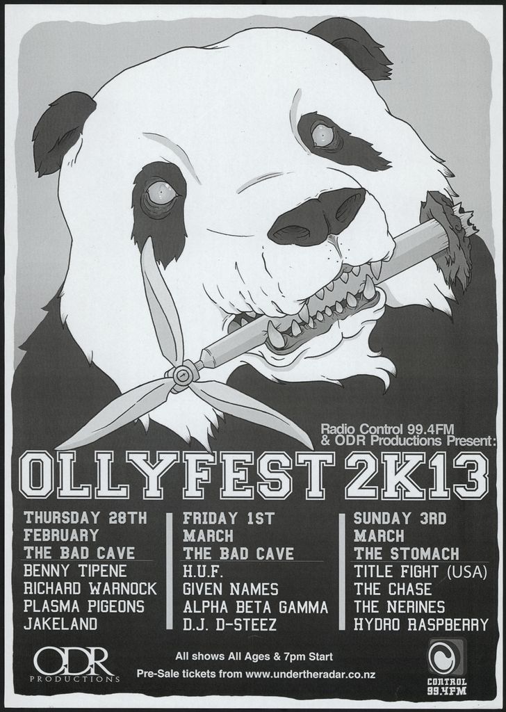 Radio Control 99.4FM & ODR Present: OLLYFEST 2K13. Thursday 28th February: The Bad Cave, Benny Tipene, Richard Warnock, Plasma Pigeons, Jakeland. Friday 1st March: The Bad Cave, H.U.F., Given Names, Alpha Beta Gamma ,D.J. D.Steez. Sunday 3rd March: The Stomach, Title Fight (USA), The Chase, The Nerines, Hydro Raspberry. All ages & 7pm start. Pre-Sale tickets from www.undertheradar.co.nz.