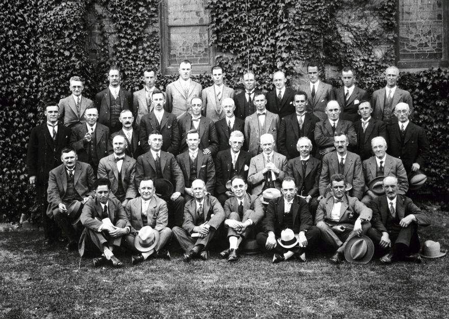 A Town Clerks conference was held annually, prior to the Municipal Conference. This group photograph has been taken outside of All Saints Church. Mr J. R. Hardie the Palmerston North Borough Council Town Clerk is in the second row, second form the left.