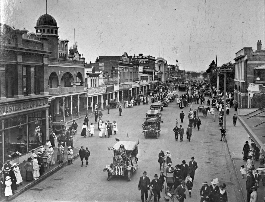 The Patriotic Society's fund raising procession entering Coleman Place from The Square. The Patriotic Society was created in 1916, during World War One, for fund raising and welfare purposes.
