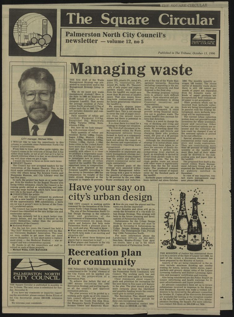 The Square Circular was Palmerston North City Council's monthly community publication, informing Palmerstonians of PNCC initiatives, activites, and events. This month's issue includes: Michael Willis; waste management; urban design strategy; earthquake prone buildings; Christmas parade; summer fun guide; art gallery; community leisure centre; tennis courts; Coleman Place; safer community council; noise complaints; abandoned vehicles; civil defence; tree planting; residential property transactions; creative communities arts funding; meetings.