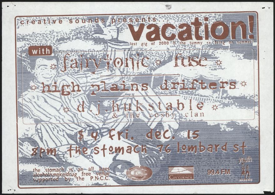 Creative sounds presents Vacation! last gig of 2000@ the tummy. Bring on summer!! With Fairytonic fuse. High plains drifters. d.j. hukstable & the cosby clan.