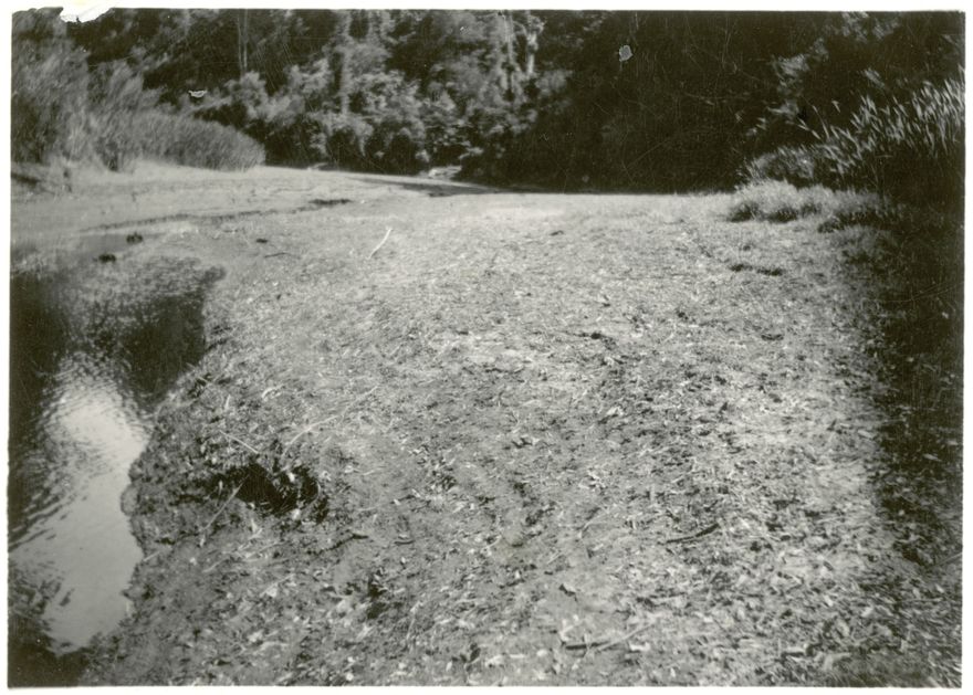 Palmerston North experienced a period of severe water shortage in the summer of 1943-1944, when the level of the lake a Turitea fell 3.5m below the bywash of the dam. This photograph shows five year's accumulation of leaf mould.