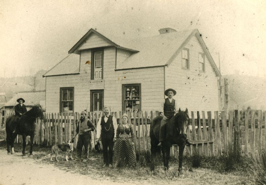 Walter Chisholm, J.P. was the first Englishman in Mauriceville. He was the storekeeper and ran his business on the site of the first schoolhouse. The photograph shows from left: Peter Petersen; Spark the dog; Peter Lollander; Walter Chisholm; Mrs Chisholm; A Forsberg.