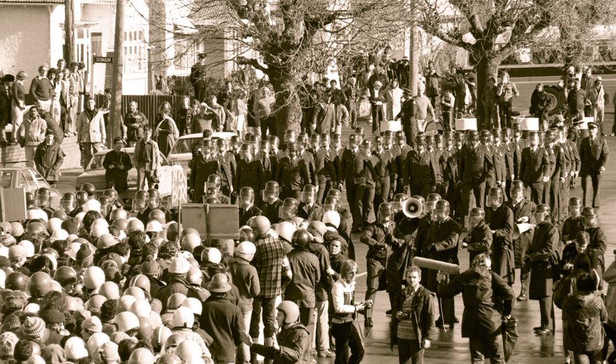 This image was taken (but not used) for a story that ran in The Manawatu Evening Standard on 01 August 1981. Extra police personnel were flown into Palmerston North in anticipation of game-day anti-Springbok Tour and anti-Apartheid protests. The Standard reported there were 1000 police, including a special riot squad, and 5000 protestors. The 1pm March culminated in a 24 minute standoff with the police lines on the corner of David and Cuba Streets.