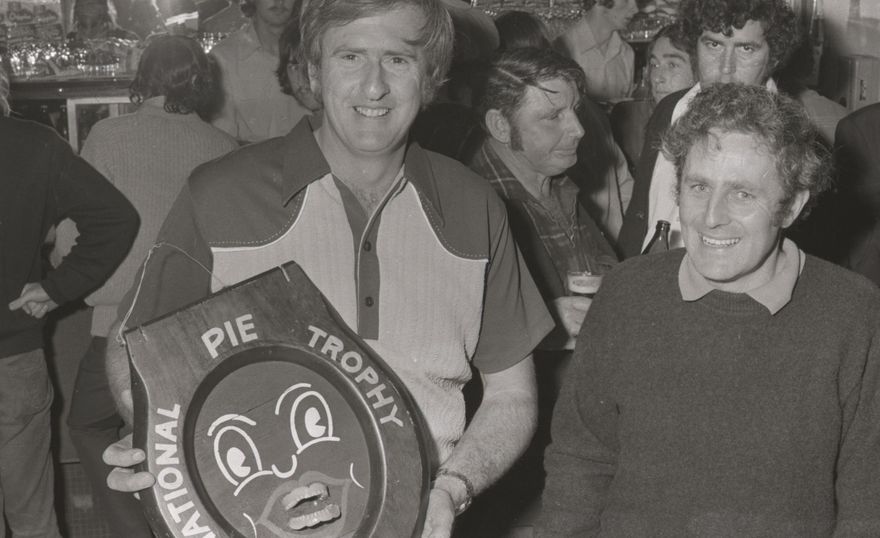 - Members of the New Zealand Power Boats Association met in Palmerston North during the weekend of 17-18 May, 1975, for their annual conference and pie eating competition. The competition was held at a Palmerston North tavern, beginning at 2 pm. It took Manawatu boaties, Des Strong and Paul Godbas just 2 minutes 14 seconds to consume 8 pies specially baked for the occasion at a Palmerston North bakehouse. It was the second consecutive win for Manawatu, who took 4 mins 3 seconds to win in 1974. Taranaki boaties were second by a wide margin. This photograph shows the winners of the competition with their sheild. Printed in the Manawatu Evening Standard 19 May 1975.