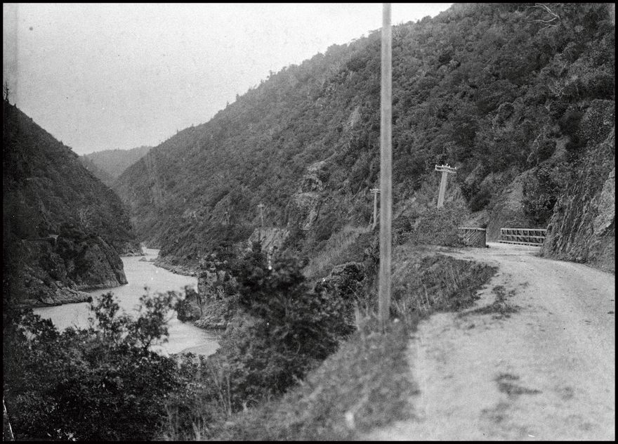 A road through the Manawatu Gorge was completed in 1872, allowing for single lane traffic through to Hawkes Bay. By the time of this photograph the road had been widened, bridges had been constructed at both ends and a railway line ran along the opposite side of the Gorge