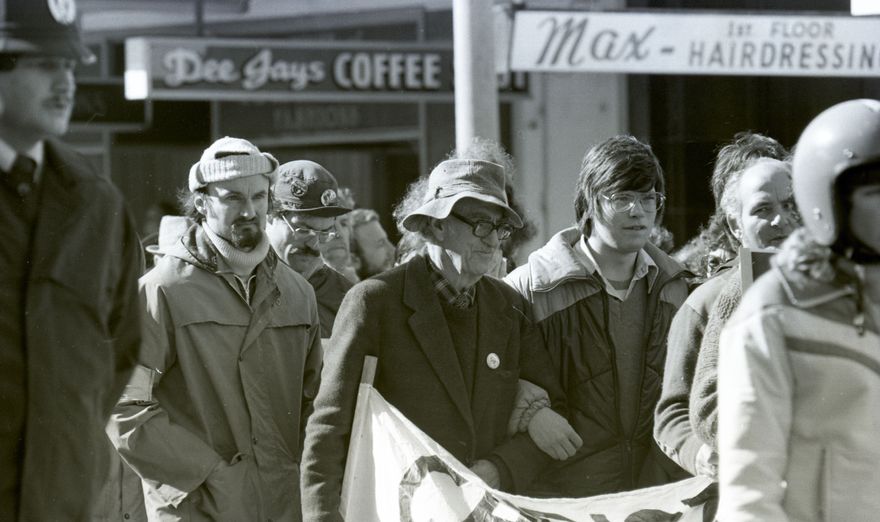 This image was taken (but not used) for a story that ran in The Manawatu Evening Standard on 15 August 1981, with the caption: "Protesters arrested in city march." This march began in Amesbury Street and continued down Broadway, to the Fitzherbert Motor Inn.