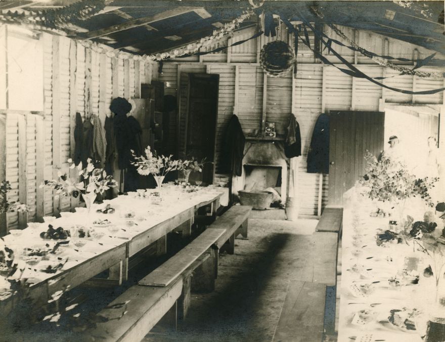 A picnic held for the Watchorn general store, at Pohangina Reserve, On this occasion tables were set out inside.