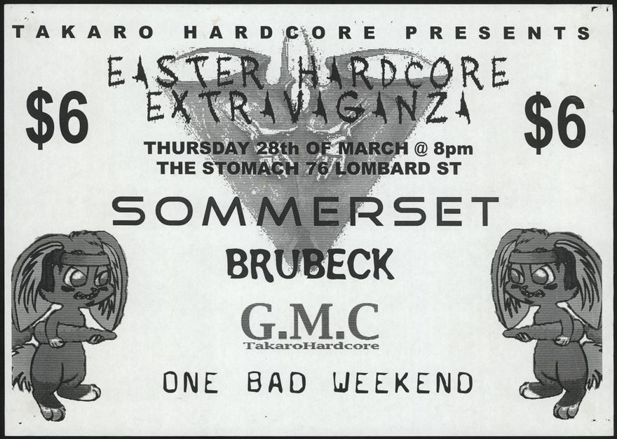 Takaro Hardcore presents: Easter Hardcore Extravaganza. $6. Thursday 28th of March @ 8pm. The Stomach 76 Lombard St. Sommerset, Brubeck, G.M.C. TakaroHardcore. One Bad Weekend.