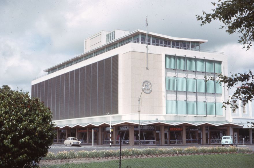 A street view of the Palmerston North Public Library, on the corner of Main Street and the Square, taken from behind the rose garden in the Square. The Harrods Shoe Shop, Bernina Sewing Centre and C.G. Hyde Jewellers can be seen on the ground floor facing the Square.