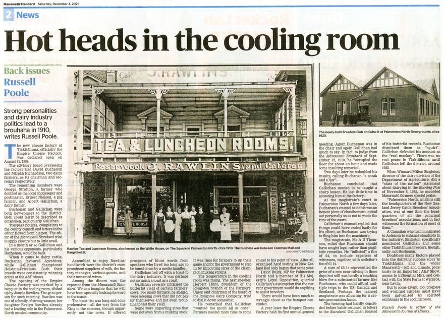 Local historians weekly "Back Issues" article in the Manawatū Standard. The new cheese factory at Tiakitāhuna, officially the Empire Cheese Factory, was declared open on August 31 1909. It was marked with a banquet in the cooling room. The advisory board consisted of strong personalities, creating debate and disagreement from its beginnings.