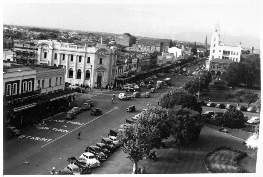 Probably taken from the C M Ross department store, looking down one side of The Square, past Rangitikei Street corner, to Broadway. The larger whitish building near centre is the former Bank of New Zealand. the other tall whiteish building at right is the Australasian Temperance and General Mutual Life Assurance Society Ltd (T&G) building is on the right (built 1937) and beside that is the Bank of Australasia. Further down Broadway Avenue can be seen St Patrick's Church.