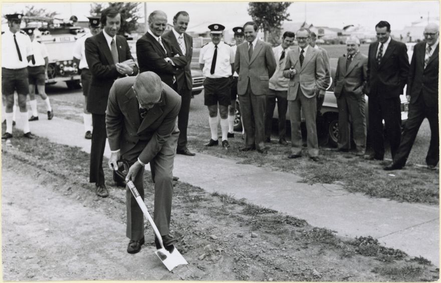 Councillor Gordon R Kear turning the first sod for a new Fire Station which was constructed in Cook Street.