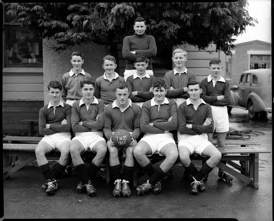 A group of eleven male students pose in their soccer uniforms. The Palmerston North Technical High School was opened in September 1909 on what is now Princess Street, Palmerston North. In 1956 the school moved to the Rangitikei Street site and became known as Queen Elizabeth Technical College. The original building and site is now used by the Universal College of Learning [UCOL]. This negative comes from the Elmar Collection - a large series of semi-identified and unidentified images from the 1930s-1970s.