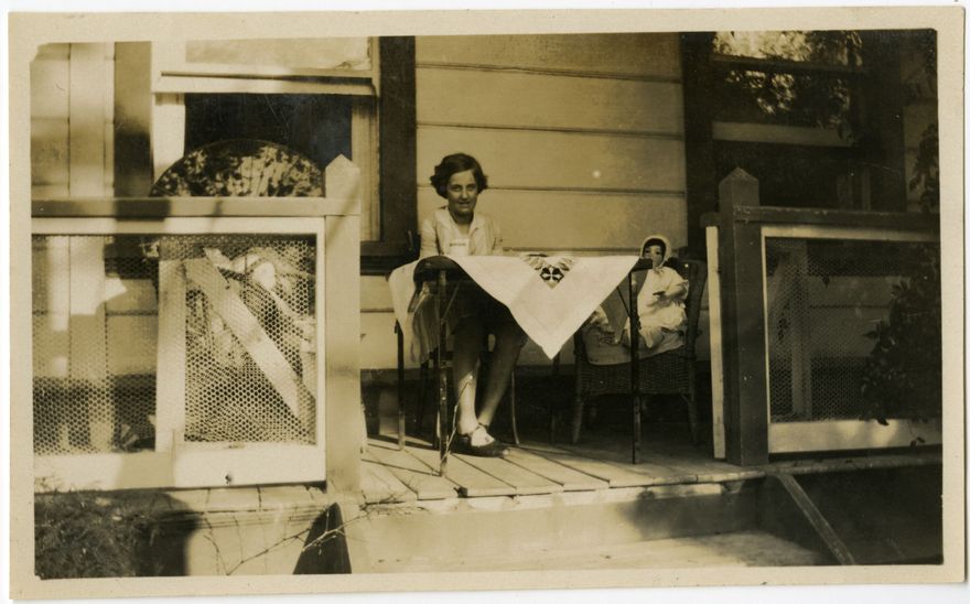 This photograph came from a small photograph album that belonged to Mrs R Andrews of Rangitikei House. This photograph bears the caption, "The Doll's Tea Party at Home May 18th 1928 PM [sic]". Marjorie is shown sitting with her doll at a table on a front porch of a house.