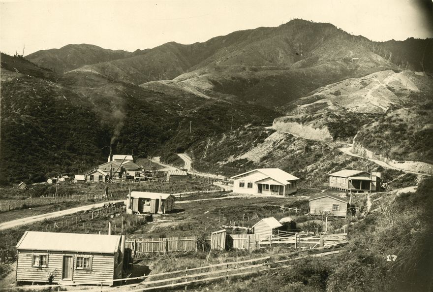 This photograph is part of a collection relating to the Mangahao Electric Power Scheme and its construction. The Scheme provides hydroelectric power, and is situated near the town of Shannon. It serves Wellington, Horowhenua, Taranaki, Hawkes Bay, and the Wairarapa. After being delayed by the first world war construction began in late 1919 and the station opened in November 1924. The large white building in the right-hand middle distance is the office.
