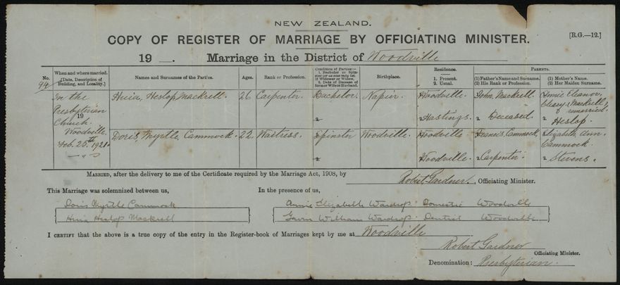 Marriage certificate for Huia Heslop Mackrell and Doris Myrtle Cammock, who married at the Presbyterian Church, Woodville, 25 February 1921.