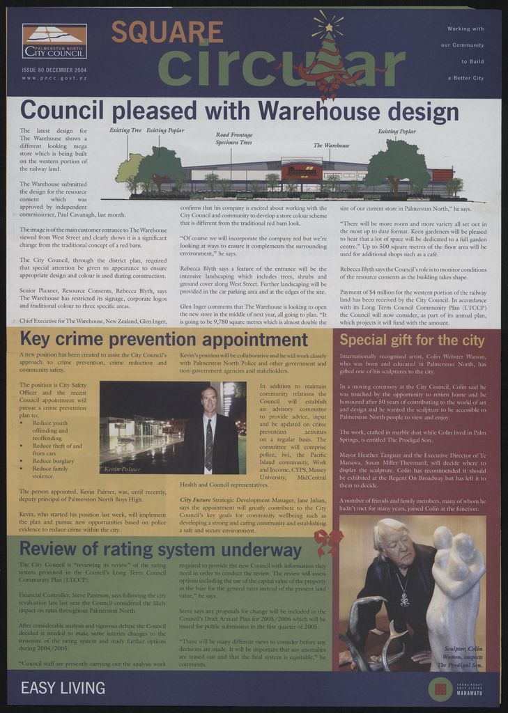 The Square Circular was Palmerston North City Council's monthly community publication, informing Palmerstonians of PNCC initiatives, activites, and events. This month's issue includes: The Warehouse; crime prevention; road safety; drainage; recycling; waste management; sculptures; rates; athletics track; sports grants; Massey; library; archives; Te Manawa; The Regent; The Square; the Esplanade; New Year's Eve.