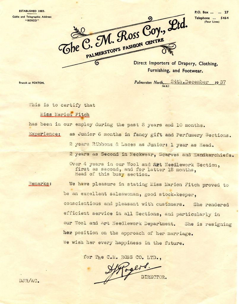 A Letter of reference regarding the employement history of Marion Fitch, a sales girl at C M Ross Co. Ltd. C M Ross Co. Ltd. was one of the foremost department stores of Palmerston North and operated in The Square from 1883 until it was sold to Milne and Choyce in 1959.