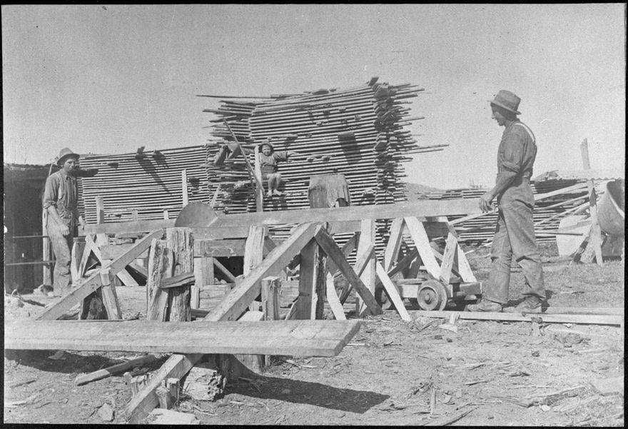 Henry and Herman Dittmer cutting timber for their house on Scotts Road, near Linton, watched by Jack Irvine (seated). The area was also known as Hilltop and Moto Rimu. The house was later sold to the Crawford brothers, one of whom remained in possession of the house until 1970. It was later wrecked by vandals.