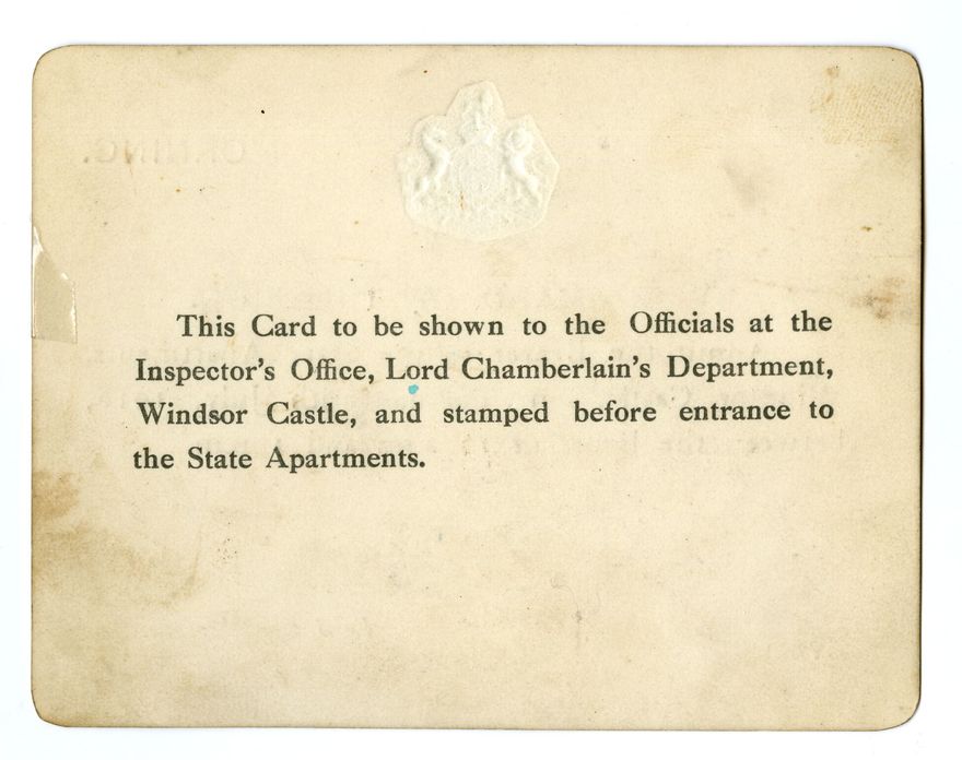 An invitation to admit the bearer to the State Apartments of Windsor Castle, signed by the Lord Chamberlain. It is stamped 9 July 1918.
