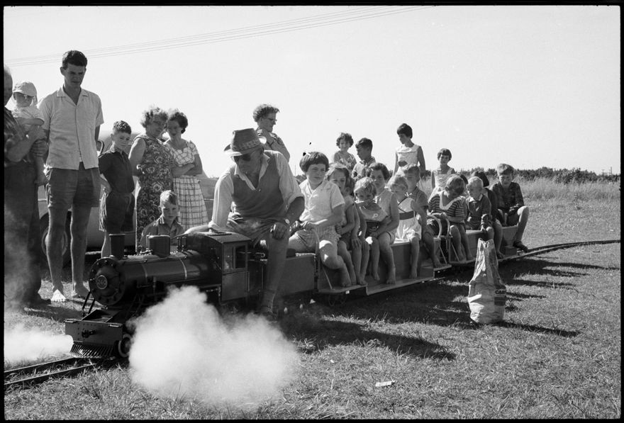 This image was taken for a story that ran in The Manawatu Evening Standard on 15th January, 1963. "Taking advantage of the brilliant sunshine during the weekend, children visiting Foxton Beach found much to amuse them. The most popular event appeared to be the rides on the model railway."
