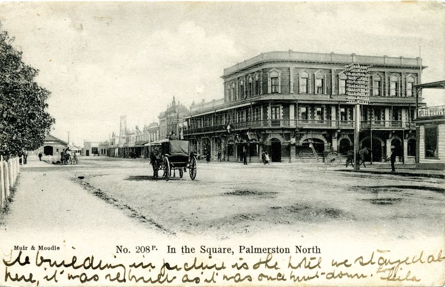 A postcard showing the Clarendon Hotel on the corner of Rangitikei Street and The Square. Inscription reads: "The building in picture is the hotel we stayed at here, it was rebuilt as it was once burnt down. Love Leila"