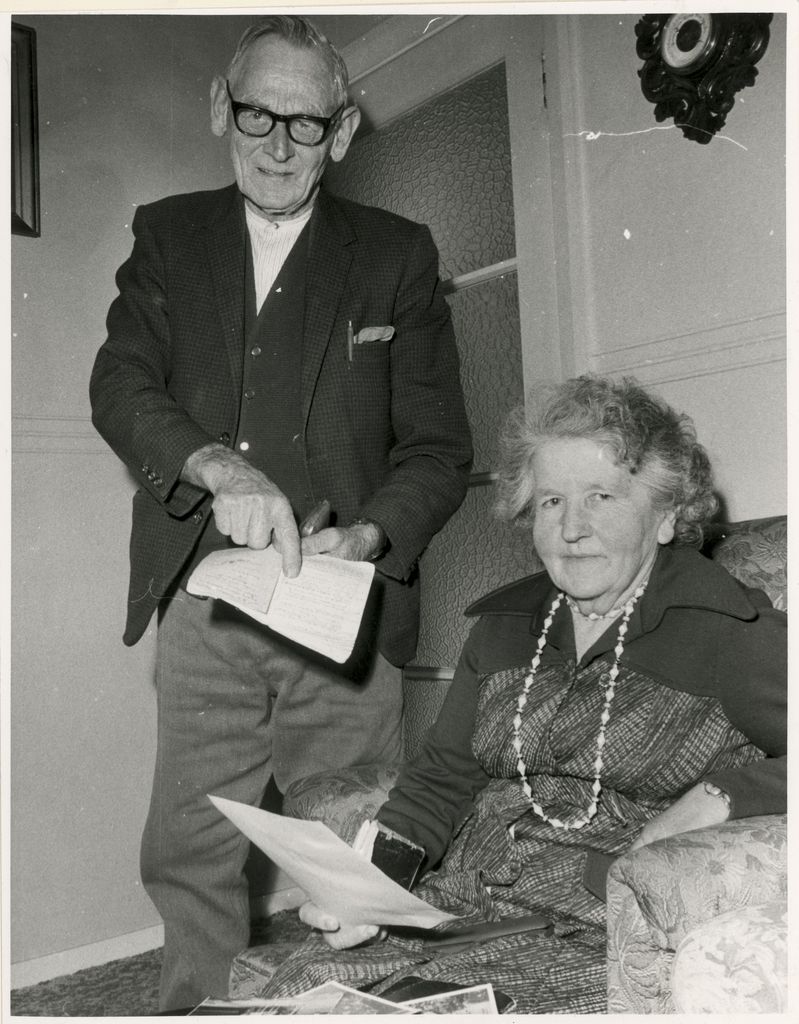 Tom Spelman (84), pictured with his wife Phyllis Myrtle Spelman (nee Arlidge), moved to the Pohangina Valley in 1896 at the age of 5. He was one of the Valley's best known residents, known also for his knowledge of the valley. He helped his parents and brother to run a dairy factory at Awahou North, which exported butter to England as well as selling it on to the local market under the trade name "Awa Tiro". The factory opened in 1910 and closed in 1914.
