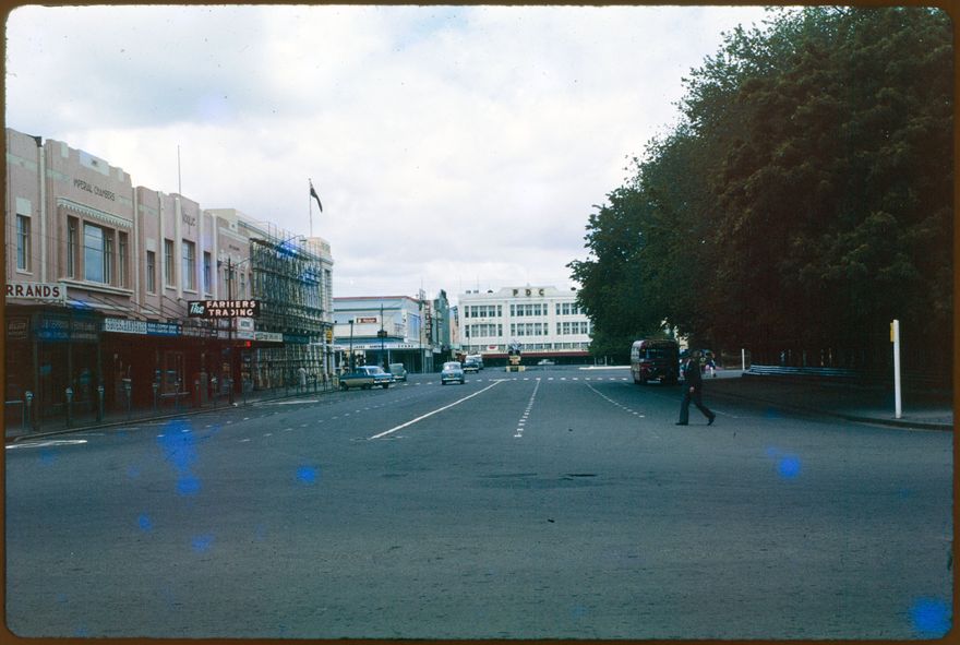 - Looking down from the Broadway end of The Square, past the Main Street corner to the the PDC department store on Church Street.