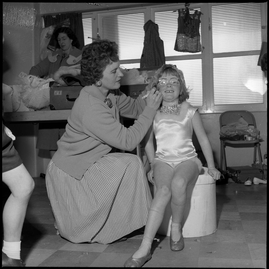 This image was not published in The Manawatu Evening Standard, taken on 6 July, 1963. [A participant in the Palmerston North Thistle Caledonian Society's competition has make-up applied before performing."
