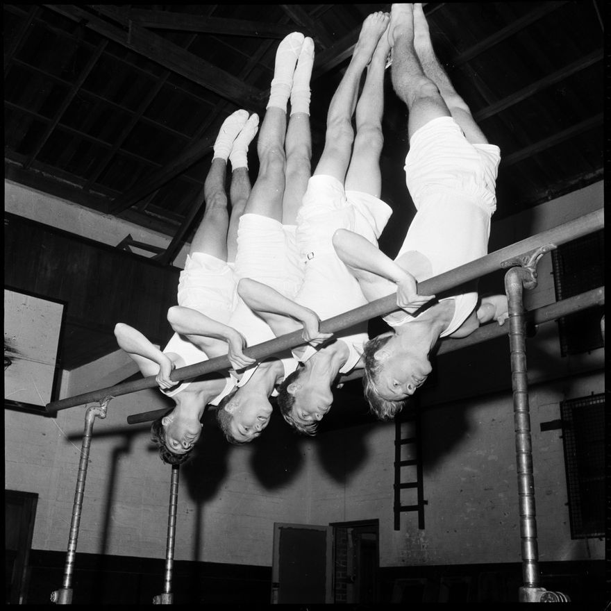 This image was taken for a story that ran in the Manawatu Evening Standard on 30 May, 1963. "Four members of the Friday evening's gymnastics class, D. Mullane, J. Rowberry, M. Todd, and H. Smith, go through their paces on the parallel bars at the Y. M.C.A. hall. A class of 60 boys are going through a programme of leadership which involves gymnastics, team games, club programmes and tournaments, both at city and national level."
